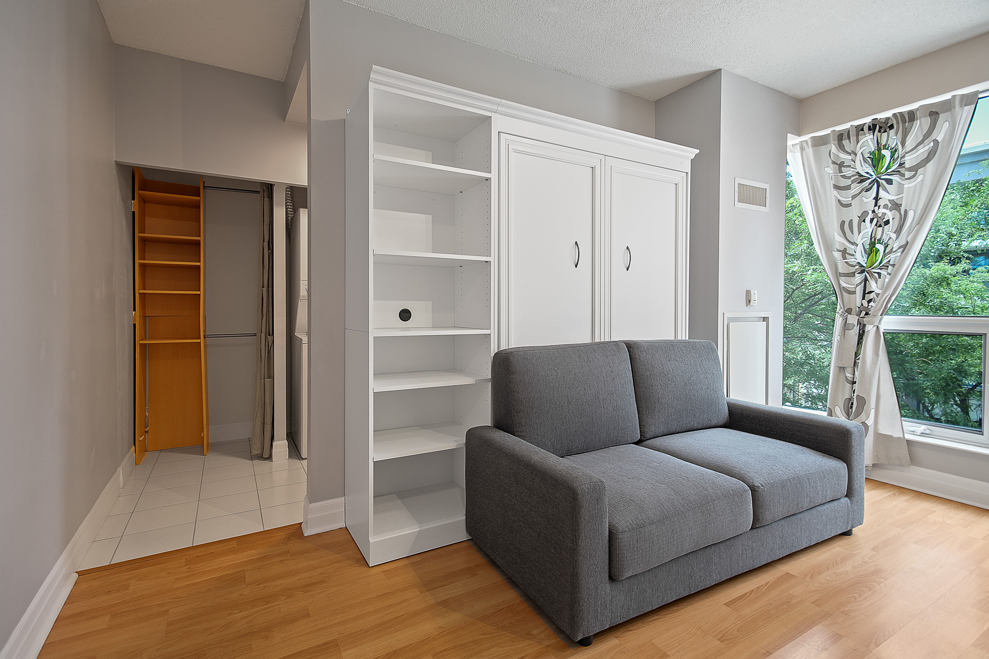 This Bachelor/Studio Condo For Rent In Mimico Is Partially Furnished With A Double Murphy Bed / Loveseat.